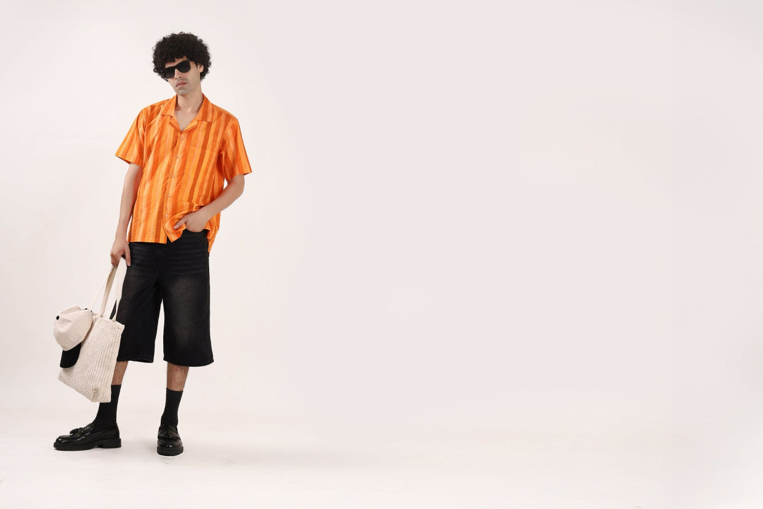 Rustic Mustard Ombre Vertical Stripe Viscose Shirt – Half Sleeves, Cuban Collar, Relaxed Fit